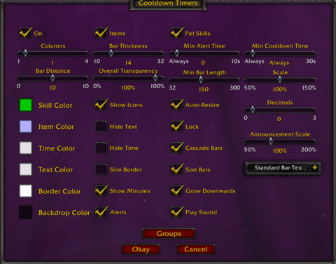 CooldownTimers (CDT) creates customizable bars that count down the remaining time until a spell, item, or ability cooldown finishes. It helps you track important cooldowns easily during gameplay.