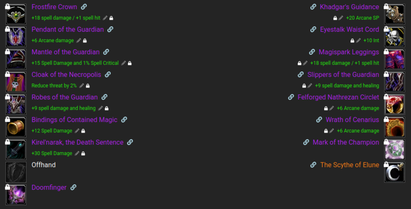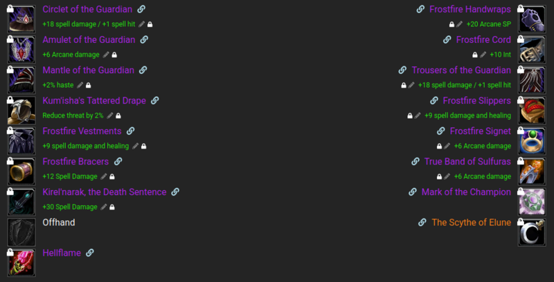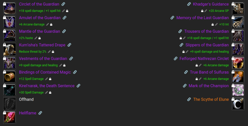 There are 2 main options you can go with on bosses, one with the best damage output and one using T3 6PC for more mana efficiency on longer bosses.