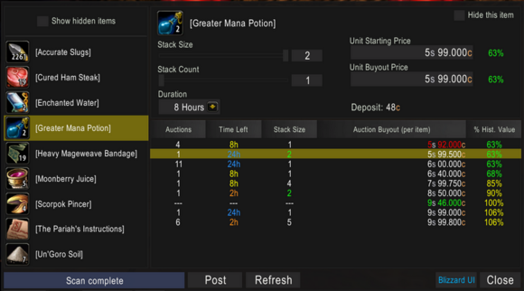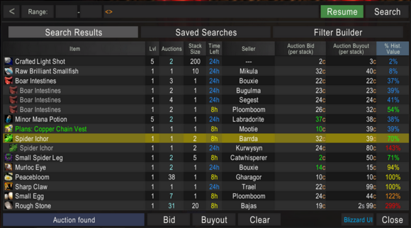 - Clicking an entry in the in the listings of bids/buyouts of existing auctions will undercut with your bid stack/buyout unit price.