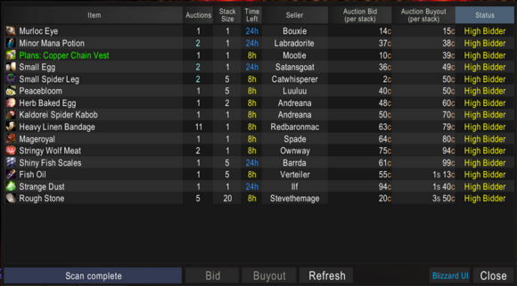 - In the listing of bids/buyouts a red price is undercutting stack/unit price.