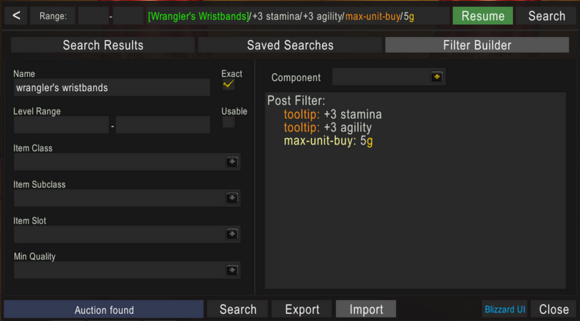 Blizzard filters can be created through the form on the left side of the "New Filter" sub-tab of the "Search" tab or typed directly into the search box. For learning to write queries you can fill in the form, add the query to the search box with the "Add" or "Replace" buttons and inspect the generated output until you feel comfortable typing them out yourself. For the most part it should be rather intuitive. The first part is special in that if it doesn't match any specific filter keyword it will be treated as a Blizzard name search. E.g., a query consisting only of felcloth would list the items Felcloth, Pattern: Felcloth Hood, Felcloth Bag etc. Usually you would want to use the exact modifier which only matches auctions where the name, apart from case, exactly equals the first part of the query. exact is the only modifier which is part Blizzard and part post filter, though it is mostly treated as a Blizzard filter. exact will tailor the Blizzard query as well as possible towards the item searched (level range, item class/subclass/slot, quality ...) and it cannot be used together with Blizzard filters for these properties.