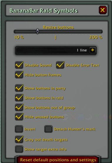 • Left-click on Raid Symbol or Hunter's Mark Button Searches for a mob with the specified symbol. BananaBar checks all raid or party members and their targets for the specified symbol or Hunter's Mark. If a matching unit is found, it will be targeted. If no units are found, an error sound is played.