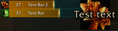 Example<syntaxhighlight lang="lua"> self:Bar("Adds incoming!", 30, "Spell_Nature_Web") self:Bar("Testing Colors!", 60, "Spell_Nature_Web", true, "red", "yellow", "green") self:Bar("More adds incoming!", { min: 20, max: 25 }, "Spell_Nature_Web") </syntaxhighlight>:Icon(name, iconnumber)