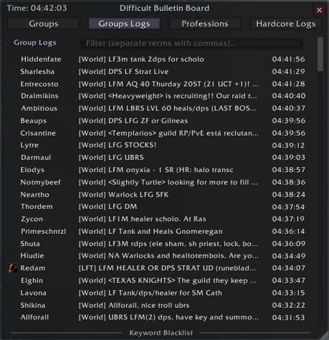 Difficult Bulletin Board scans world chat and organizes messages into an easy-to-read interface, making it simple to find groups, services, or updates.