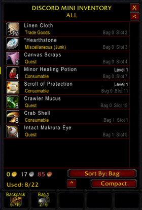 These mods replace the default spellbook and bag frames with scalable, movable, scrolling frames that display more detailed info. Both can be resized smaller, and the inventory includes extra tabs for item types, qualities, soulbound items, stacks, and up to 5 custom user-defined tabs. Bags can be named individually. Items are sortable by name, bag, quality, level, and type. There's also a compact mode similar to AllInOneInventory. Items can be dropped anywhere in the window and will automatically find the first empty slot.