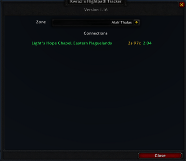 | 4/18/05 | 1.10 | Fixed SetMapToCurrentZone issues. <br> Bound key now toggles dialog correctly. <br> Alt-Z to hide UI now also hides the in-flight counter. <br> Improved zone map connection tooltip appearance. <br> Updated regex to handle foreign characters. <br> Display version on dialog. <br> Fixed cross-faction path display on Booty Bay map. <br> Fixed zone change behavior with open dialog.