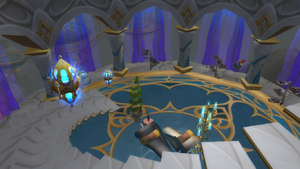 The Golden Dawn Institute is a floating building located by the entrance to the high elven capital of Alah'Thalas that serves host to refugees and travellers from afar. The grounds below the institute leading to the gates of the city are host to a ranger training ground, an auction house and bank, Tiriel Brightwater's inn that additionally serves as a home to refugees, and the sanctum of the Grand Magistrix of the Silvermoon Remnant, Merisa Dawnbreaker.