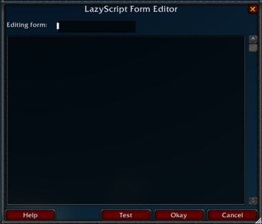 /lazyscriptor/ls: Executes your currently set default form./lazyscript help: Displays a list of available slash commands and their descriptions./lazyscript about: Opens the in-game about frame for LazyScript, showing credits and basic information./lazyscript debug: Toggles debug mode on or off. Debug messages provide more detailed information about what the addon is doing, which can be helpful for troubleshooting./lazyscript list: Lists all the forms you have currently defined. The default form will be marked with an asterisk (*)./lazyscript edit <formName>: Opens an in-game editor for the specified form. This is the primary way to create and modify your forms./lazyscript set <formName> <action1> -<condition1> <action2> -<condition2> ...: Creates or updates a form with the given name and defines its actions and conditions. This is a more advanced way to define forms directly via the chat.