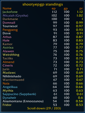 Right-click on mini-map or FuBar shootyepgp icon will show all available settings. Left-click shows the standings window with everyone's EP, GP and PR values. The standings window can also be toggled with /shooty show chat command.