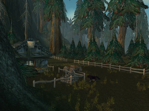 Silverpine Forest, or simply Silverpine, is a vast, ancient wood that runs along Lordaeron's rugged western coast. The land ranges from fairly flat to hilly, and is nestled among even taller mountains. The forest is eerily silent save for the occasional unnatural howling echoing among the trees. Mossy overhangs shiver in the cold breeze, and the trees are all sickly or dying. Dilapidated farmsteads and abandoned mines dot the land, home now to the darker denizens of the woods.