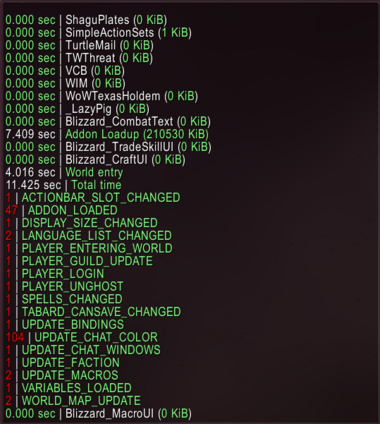 - The addon logs various events like addon load times, garbage collection, and zone changes. It helps diagnose startup performance.