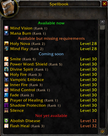WhatsTraining shows you what spells are available for training at your class trainer. It helps you easily see which spells you can learn now, which are coming soon, or which you are missing requirements for.